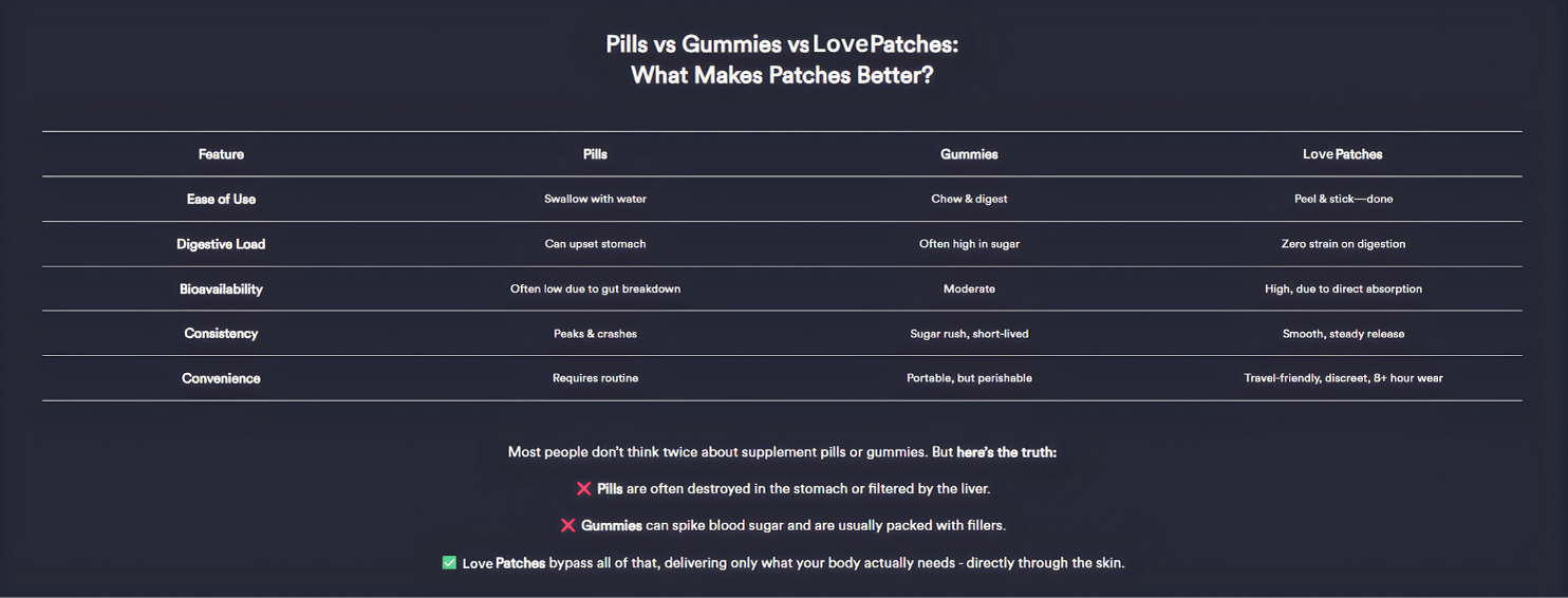 Rediscover passion and confidence with Love Patches. These innovative transdermal patches deliver libido-boosting ingredients directly into your bloodstream, helping restore hormonal balance, improve blood flow, and support your body's natural stress response. Formulated with powerful, plant-based ingredients like Maca root, ginseng, and ashwagandha, they work to target the root causes of decreased libido for long-lasting result.